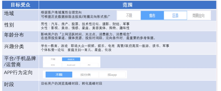 結(jié)合廣告主產(chǎn)品的用戶屬性(如年齡、地域、性別、時(shí)間段等)來設(shè)置,從而提升效果達(dá)成轉(zhuǎn)化。