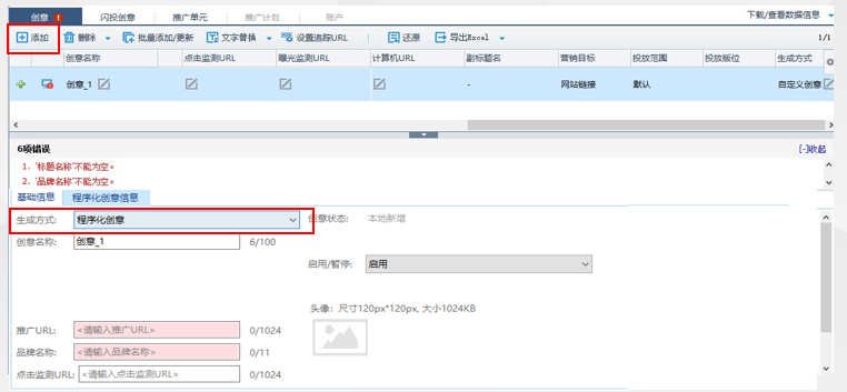 1.填寫程序化創(chuàng)意“基礎(chǔ)信息”:點(diǎn)擊“添加創(chuàng)意”,在編輯區(qū)選擇生成方式,請(qǐng)選擇“程序化創(chuàng)意”,在基礎(chǔ)信息編輯區(qū)填寫創(chuàng)意名稱、推廣URL等信息。
