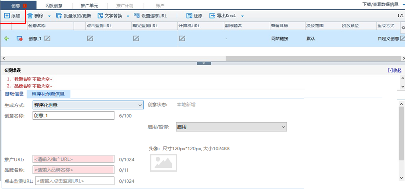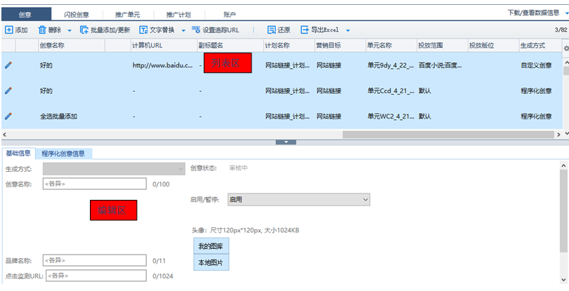 基礎(chǔ)信息(如創(chuàng)意名稱、url)可在列表區(qū)編輯,程序化創(chuàng)意標(biāo)題名稱、樣式僅可在編輯區(qū)編輯;