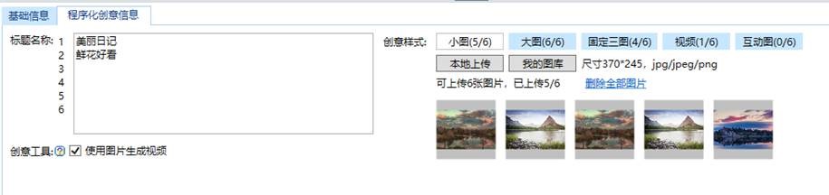 2.填寫“程序化創(chuàng)意信息“:生成方式里選擇“程序化創(chuàng)意“后,基礎(chǔ)信息右側(cè)即可出現(xiàn)“程序化創(chuàng)意信息”,在該編輯區(qū)輸入標(biāo)題名稱,以及上傳相應(yīng)的樣式。生成方式一旦上傳成功則無(wú)法修改。