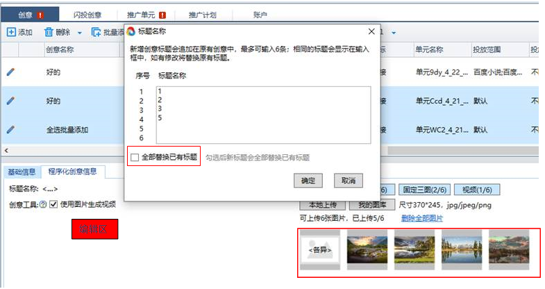 b.“程序化創(chuàng)意信息“批量編輯:點(diǎn)擊標(biāo)題名稱,彈框顯示多個(gè)程序化創(chuàng)意共同的標(biāo)題,可進(jìn)行批量編輯,即批量刪除、添加或者全部替換標(biāo)題。
