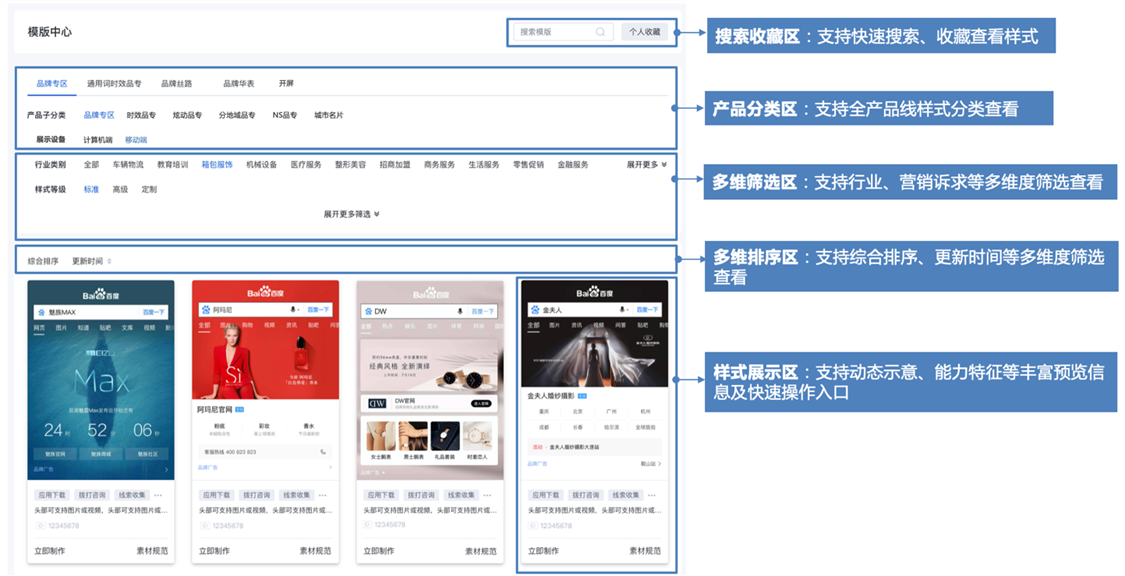 品牌廣告官網模板中心頁是客戶選擇品牌廣告樣式的主要查閱頁面,為了更好地支持客戶快速選取、使用所需的創意樣式,提升使用效率,對品牌廣告官網模板中心進行了改版升級。