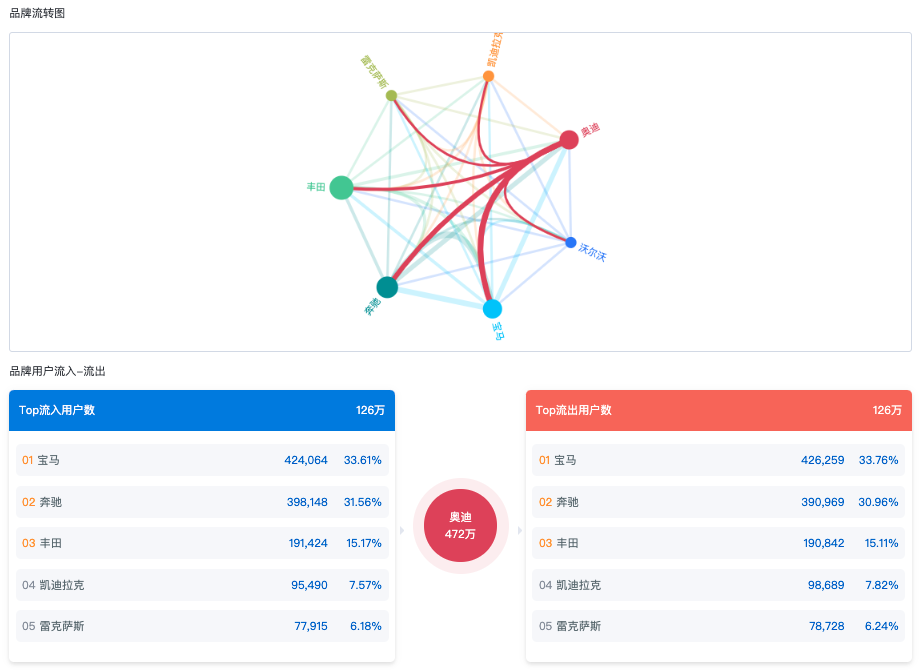 通過流轉(zhuǎn)圖及流出-流出用戶數(shù),直觀呈現(xiàn)品牌用戶的競品流轉(zhuǎn)偏好;