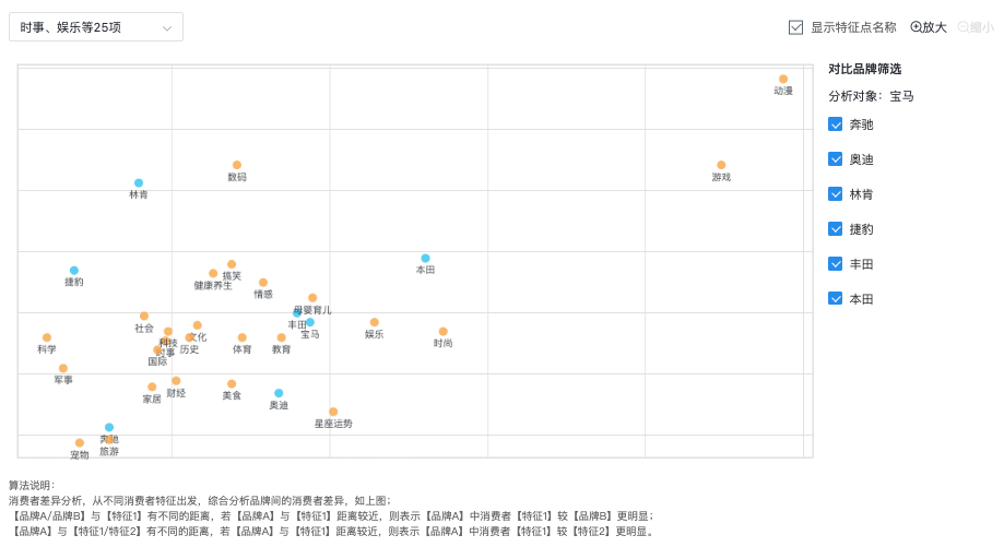 【旅游】特征,離奔馳最近,其次是奧迪/捷豹等品牌,可判斷為奔馳消費者在5月期間對旅游類內(nèi)容較其他品牌,更顯著;【動漫/游戲】2個閱讀特征,離所有汽車品牌都很遠(yuǎn),表示汽車消費者對游戲/動漫類內(nèi)容的閱讀偏好都不強;