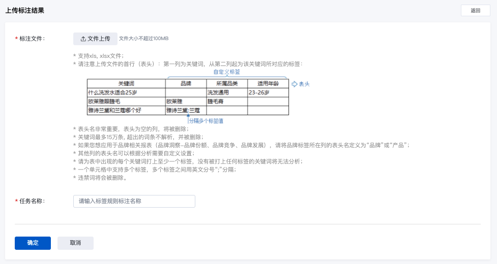 - 上傳標(biāo)注結(jié)果,離線完成對關(guān)鍵詞的標(biāo)簽標(biāo)注,以Excel形式上傳