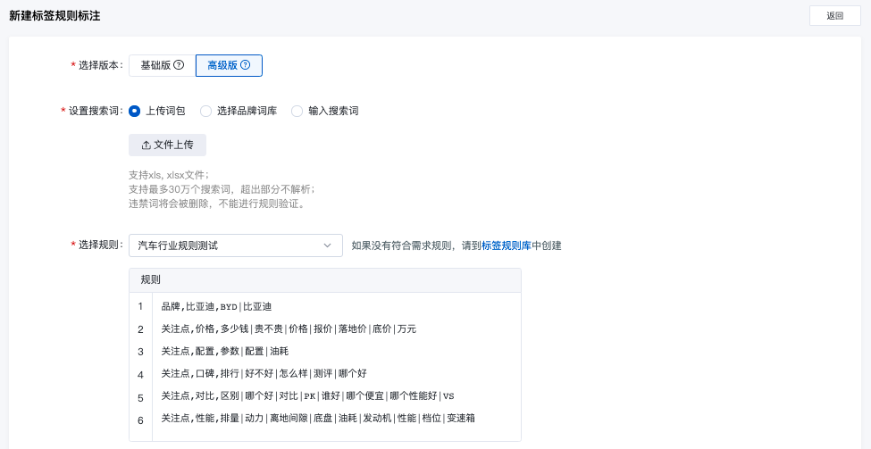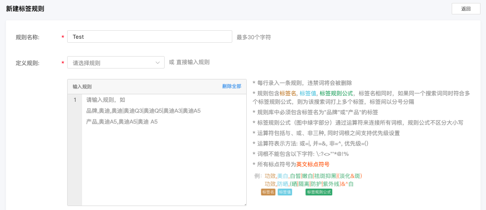 備注:定義標(biāo)簽規(guī)則時,建議以【詞根】形式定義標(biāo)簽規(guī)則,不需要為所有關(guān)鍵詞打標(biāo)簽;
