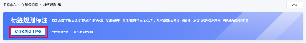 - 標(biāo)簽規(guī)則標(biāo)注任務(wù),在線定義關(guān)鍵詞的標(biāo)簽規(guī)則,系統(tǒng)自動為關(guān)鍵詞打標(biāo)簽