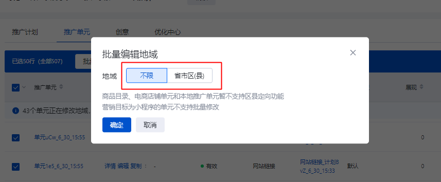 Step2:選擇【不限 】則默認當前所選的所有單元,直接修改為不限地域投放;選擇【省市區(縣)】則進入省市區縣批量修改頁面(見下一步):