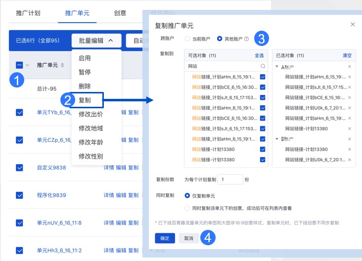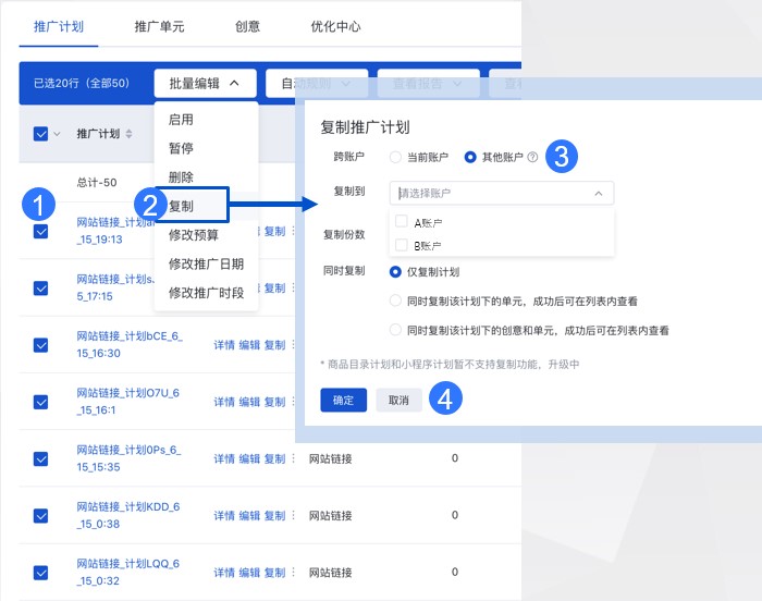 2.2跨賬戶復制:進入推廣賬戶的計劃/單元列表,使用跨賬戶復制功能