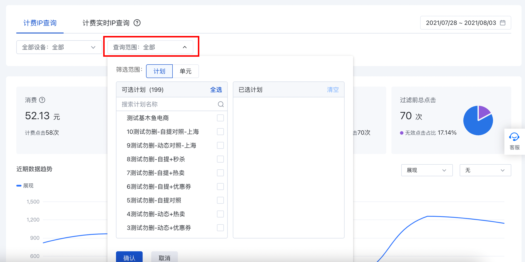 可通過點(diǎn)擊“計費(fèi)IP查詢”下的“查詢范圍”來進(jìn)一步篩選計劃和單元: