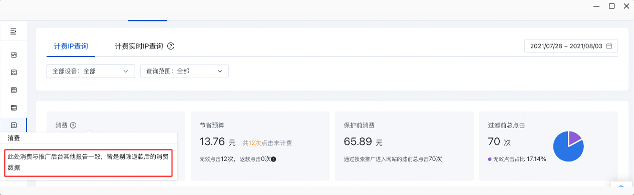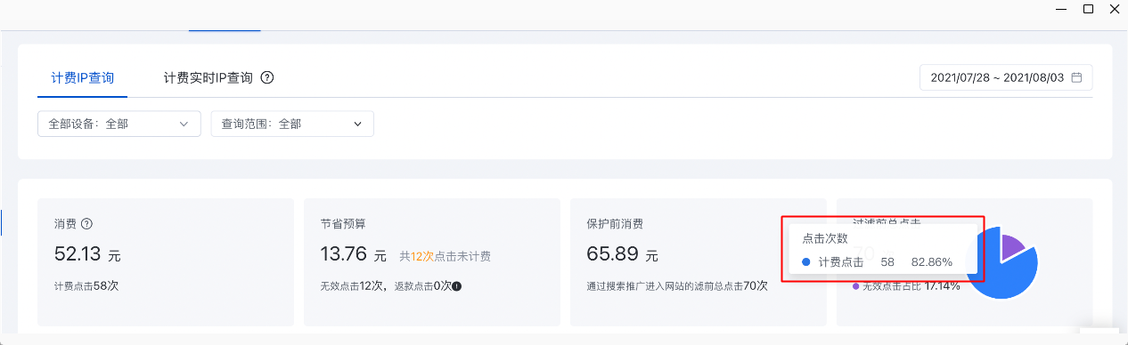 1.4“點(diǎn)擊情況分布”餅圖表述升級:分別呈現(xiàn)無效點(diǎn)擊、無效點(diǎn)擊占過濾前總點(diǎn)擊占比,以及計費(fèi)點(diǎn)擊、計費(fèi)點(diǎn)擊占過濾前總點(diǎn)擊占比: