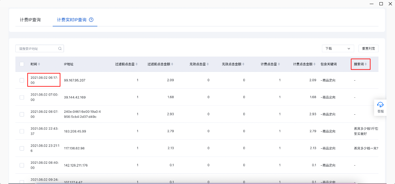 2. 計費(fèi)實(shí)時IP查詢頁面:提供秒級數(shù)據(jù)查看,并同樣支持搜索詞維度的數(shù)據(jù)查看: