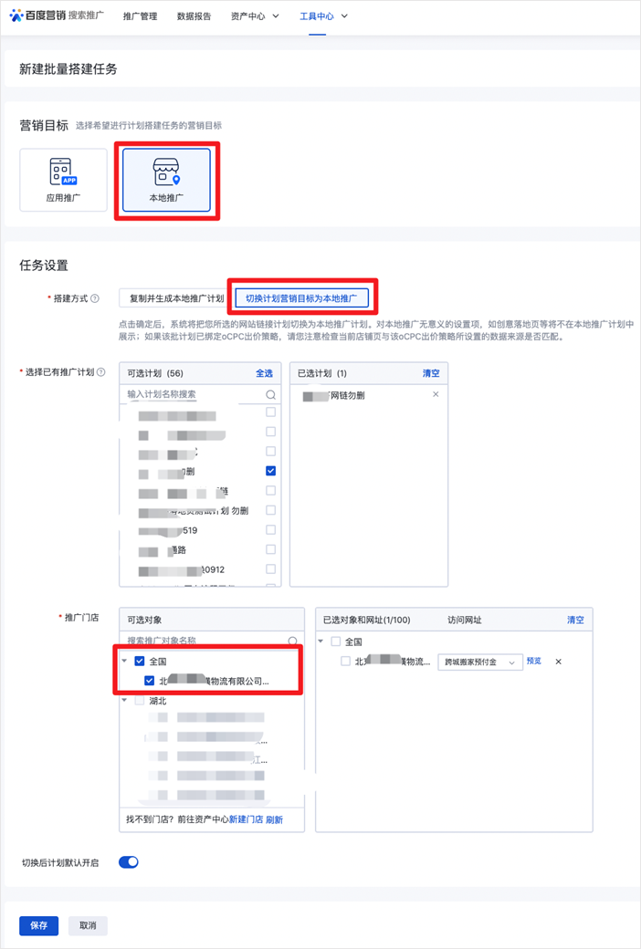 2、投放:強烈建議使用「本地推廣批量搭建助手」,將已有計劃一鍵切換為本地推廣目標投放惠生活阿拉丁