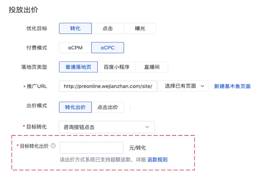 返款統(tǒng)計周期統(tǒng)一為「單元首次開始投放的那一刻開始,及其之后的3個自然日。如1.1日單元首次開始投放,1.1日-1.4日為返款統(tǒng)計周期?!鼓梢栽谛畔⒘魍斗牌脚_-推廣管理-推廣單元的投放出價設置中,選擇“付費模式-oCPC”見詳細返款規(guī)則。