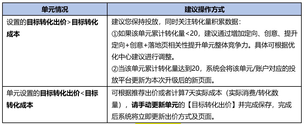 A:您可以正常優(yōu)化單元的定向、創(chuàng)意、落地頁、出價模塊,在優(yōu)化出價時,當您修改【目標轉(zhuǎn)化出價】并完成保存后,系統(tǒng)會將該單元/賬戶對應的投放平臺更新為本次升級后的新頁面。