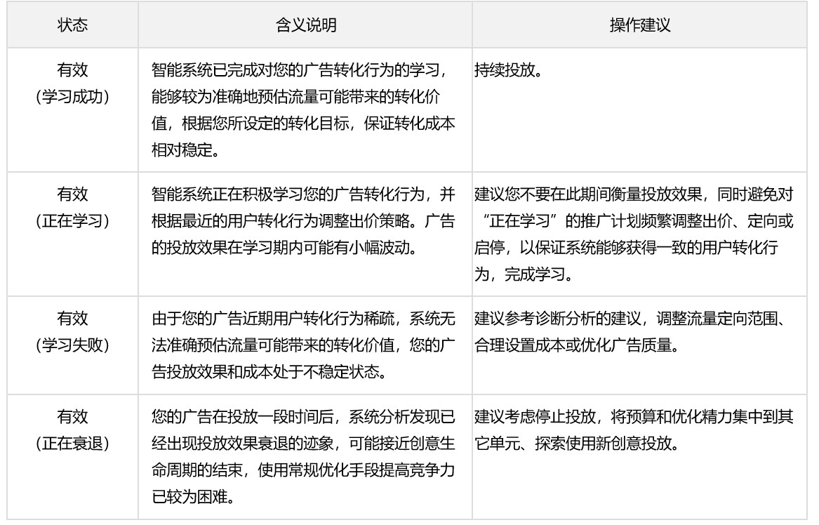 針對優(yōu)化目標為轉(zhuǎn)化(oCPC/oCPM)的“有效”狀態(tài)下的單元,在“有效”文案后增加展示學習期狀態(tài),包括“正在學習、學習成功、學習失敗、正在衰退”4種。學習狀態(tài)含義說明如下: