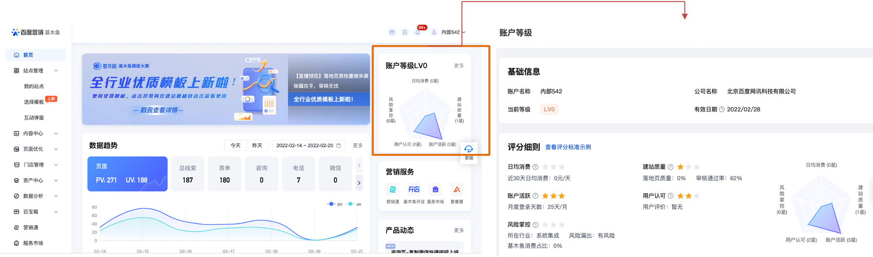 2.功能簡(jiǎn)述:基木魚賬戶等級(jí)設(shè)有LV0~LV5,依據(jù)消費(fèi)量級(jí)、風(fēng)險(xiǎn)掌控力、建站質(zhì)量、賬戶活躍度、用戶認(rèn)可5個(gè)評(píng)分維度進(jìn)行賬戶等級(jí)計(jì)算。系統(tǒng)每月1日自動(dòng)更新賬戶等級(jí)相關(guān)信息,查看路徑:在基木魚平臺(tái)首頁右上方,即可查看您的賬戶等級(jí),點(diǎn)擊“更多”即可查看賬戶等級(jí)的各維度評(píng)分及權(quán)益信息。