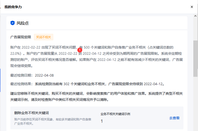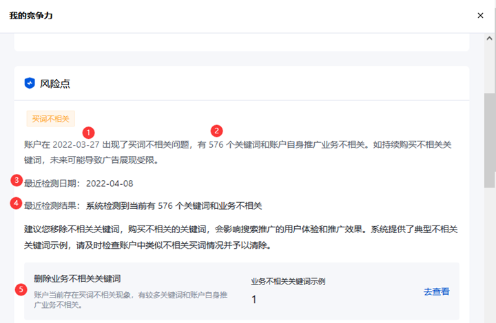 - 【我的競爭力】新增對存在少量不相關關鍵詞賬戶披露“買詞不相關”風險點詳情、最近檢測結果、優化建議