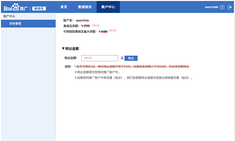 1、離線寶余額轉(zhuǎn)出:登錄離線寶平臺(tái) http://lxb.baidu.com,進(jìn)入賬戶中心,轉(zhuǎn)出余額。