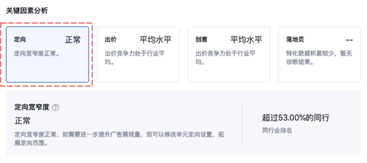 2.1診斷面板分區說明:診斷面板分為上下兩部分。上部展現當前單元整體診斷結果,快速呈現單元概要診斷信息;下部展現當前單元的關鍵因素分析,常駐4類診斷摘要卡片,分別是定向、出價、創意、落地頁,披露該物料層級的數據變化趨勢: