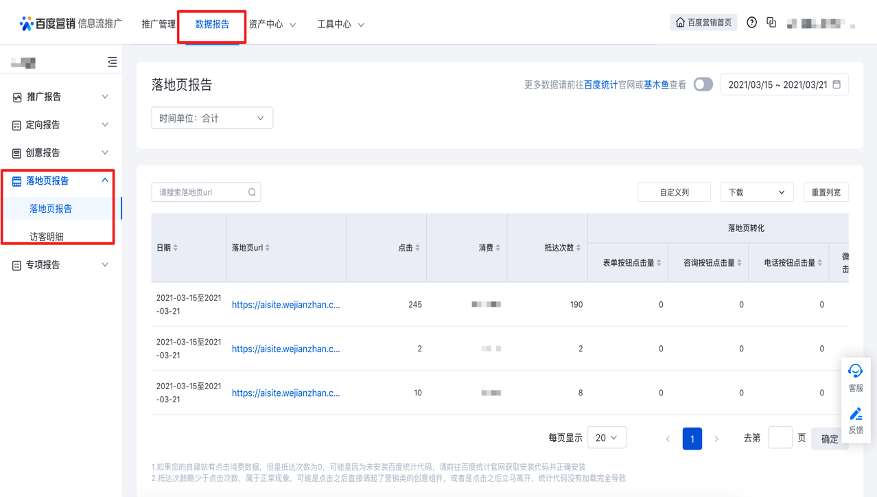 ③入口:信息流推廣平臺 → 數據報告 → 落地頁報告→訪客明細