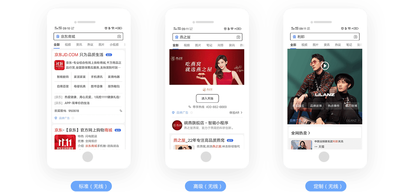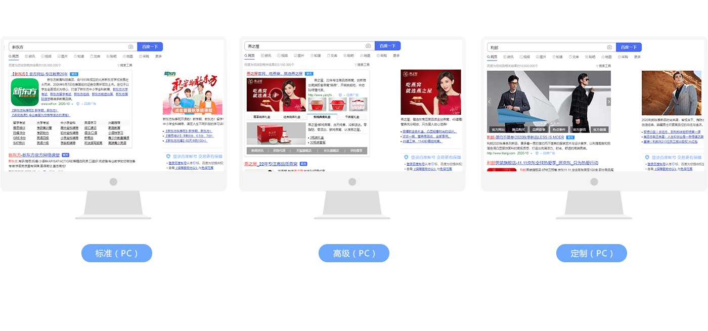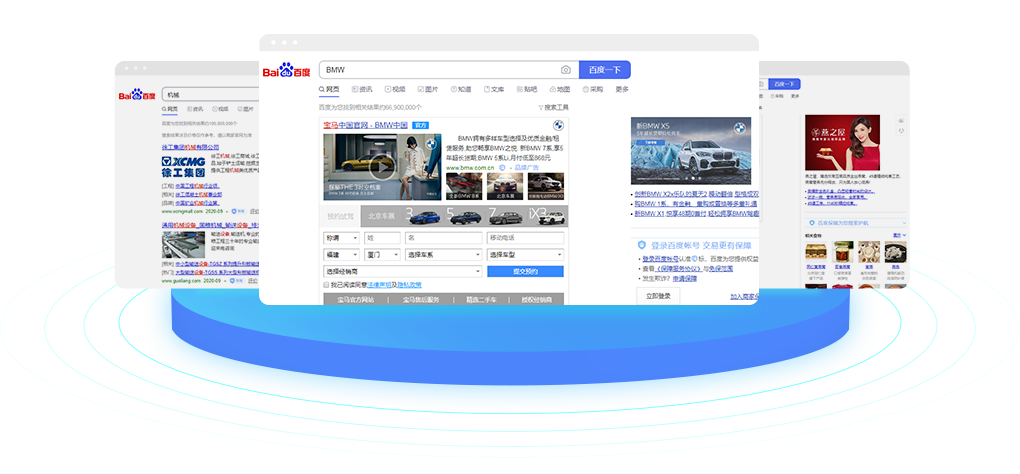 搜索結果首頁黃金位置,也可呈現在百度新聞、百度知道、百度百科、百度圖片、百度視頻、百度地圖等子頻道